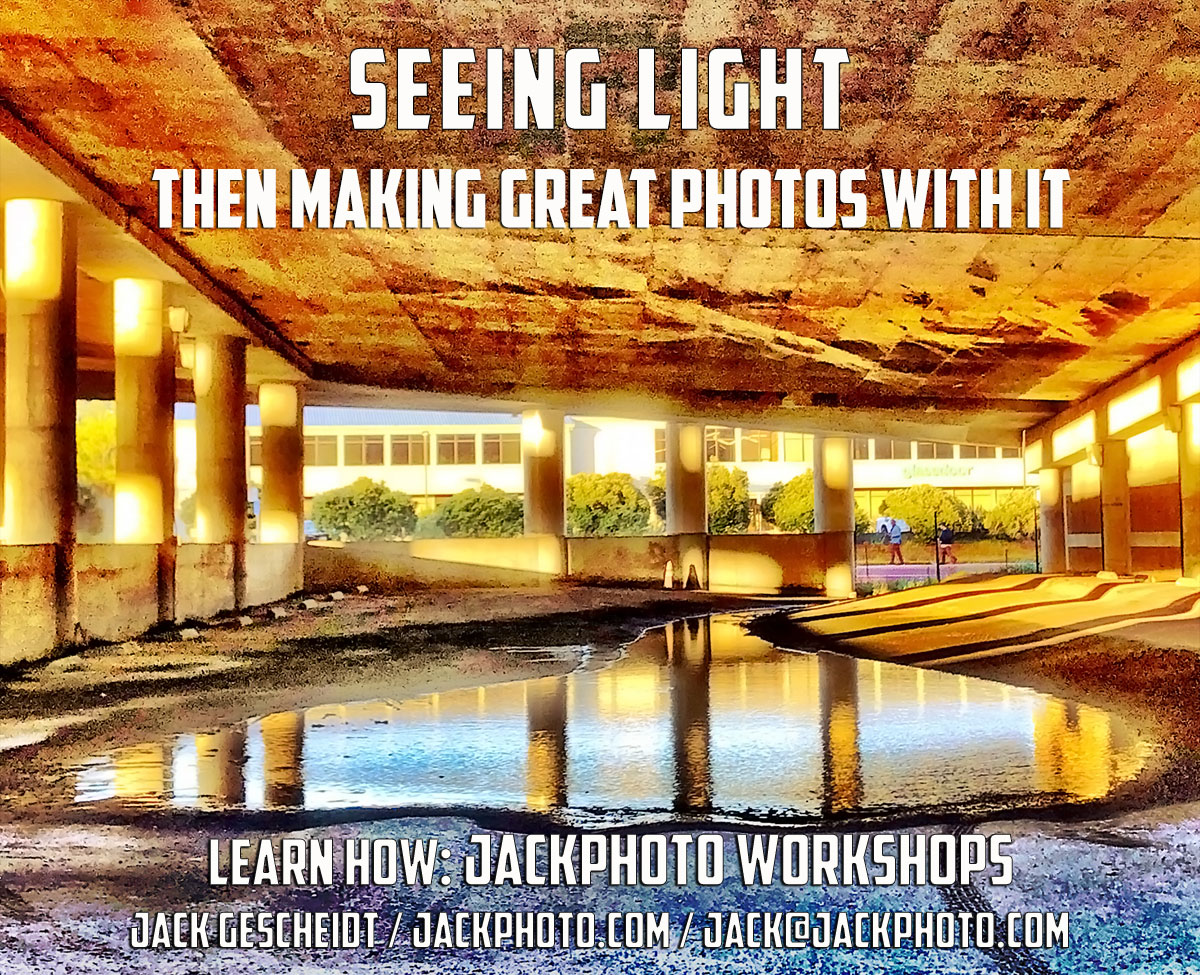 Intermediate Level workshops: you know camera basics (shutter speeds, aperture, ISO, manual settings), but want to hone your skills, more understand and exploit depth-of-field, and then learn more about seeing, finding, and working with light, composition, and subjects.